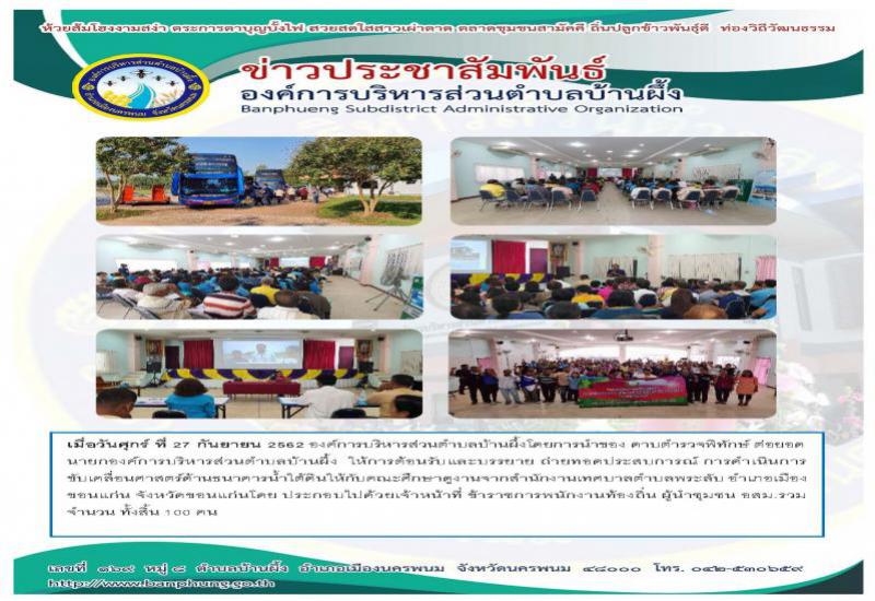 วันที่ 27 กันยายน 2562 องค์การบริหารส่วนตำบลบ้านผึ้ง โดยการนำของ ด.ต.พิทักษ์ ต่อยอด นายก อบต.บ้านผึ้ง ให้การต้อนรับและบรรยายถ่ายทอดประสบการณ์การดำเนินการขับเคลื่อนศาสตร์ด้านธนาคารใต้ดินให้กับคณะศึกษาดูงานจากสำนักงานเทศบาลตำบลพระลับ อ.เมืองขอนแก่น จ.ขอนแก่น จำนวน 100 คน (8 ภาพ)
