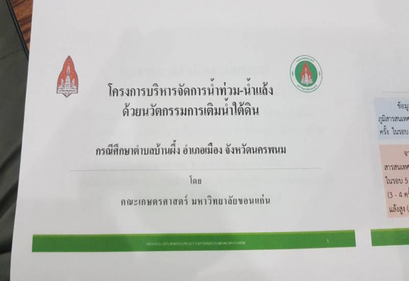 9-9-61 องค์การบริหารส่วนตำบลบ้านผึ้งรับคณะทำงาน นักวิจัย โครงการบริหารจัดการ น้ำท่วมน้ำแล้ง ด้วยนวัตกรรมเติมน้ำใต้ดิน กรณีศึกษาตำบลบ้านผึ้ง อ.เมือง จ.นครพนม เพื่อชี้แจ้ง ขั้นตอน รายละเอียดการดำเนินการวิจัย ตลอดระยะเวลาราวๆ 12 เดือน นับแต่อาทิตย์หน้า เป็นต้นไป พร้อมนี้ มีการลงพื้นบ่อระบบเปิดห้วยวังหิน ม.9 (5 ภาพ)
