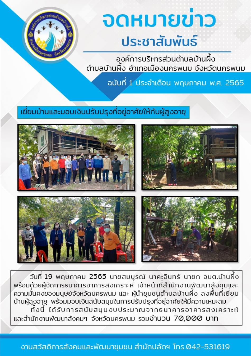 รายละเอียด : วันที่ 19 พฤษภาคม พ.ศ.2565 นายสมบูรณ์ นาคะอินทร์ นายกองค์การบริหารส่วนตำบลบ้านผึ้ง พร้อมด้วยผู้จัดการธนาคารอาคารสงเคราะห์ เจ้าหน้าที่สำนักงานพัฒนาสังคมและความมั่นคงของมนุษย์จังหวัดนครพนมและผู้นำชุมชนตำบลบ้านผึ้ง ลงพื้นที่เยี่ยมบ้านผู้สูงอายุ พร้อมมอบเงินสนับสนุนในการปรับปรุงที่อยู่อาศัยให้มีความเหมาะสม